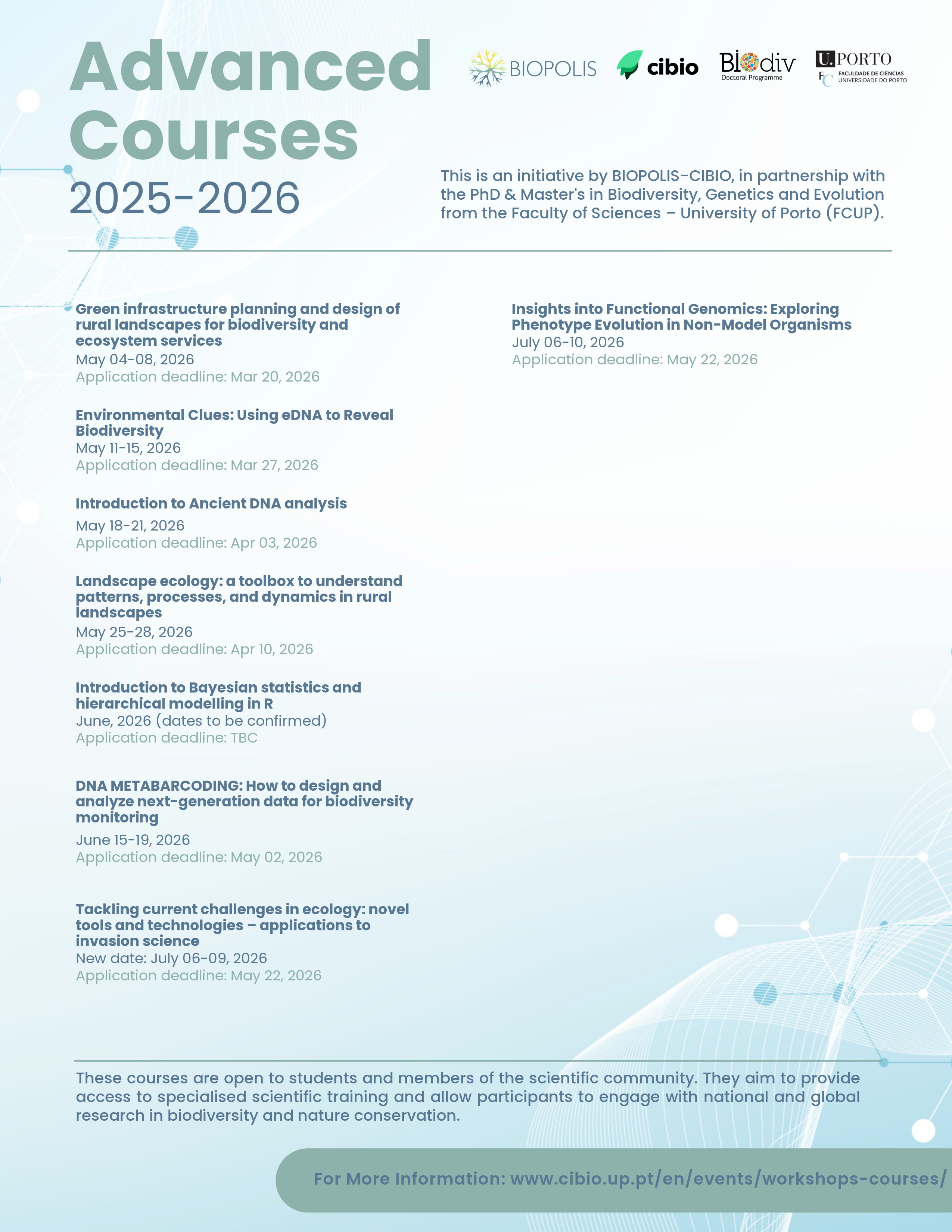 BIOPOLIS-CIBIO, in partnership with the PhD & Master's in Biodiversity, Genetics and Evolution from the Faculty of Sciences - University of Porto (FCUP), is pleased to present its Advanced Courses programme for 2025-2026.